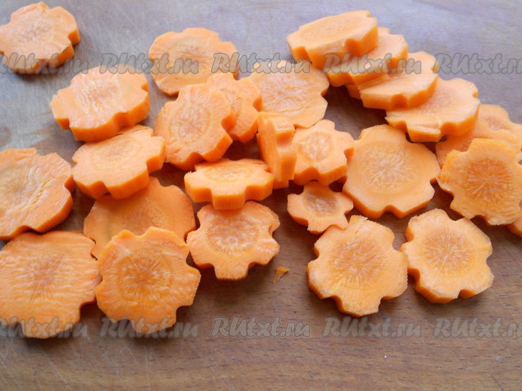 Очистить морковь с помощью овощечистки и нарезать кружочками или цветочками, толщиной около 0,5 см.