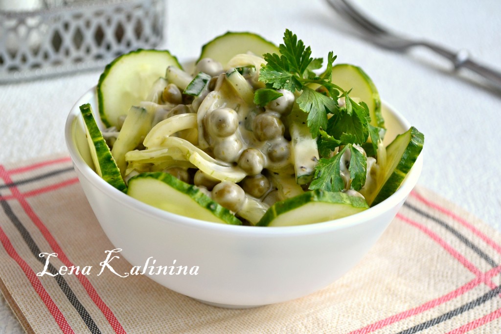 Хочу предложить вам простой рецепт очень вкусного салата из маринованных и свежих огурцов с зелёным горошком, репчатым луком и майонезом. Этот закусочный салатик готовится за считанные минуты, из обычных продуктов, получается аппетитным и достаточно сытным. Такой салат можно подать в качестве закуски к мясу или как дополнение к гарниру. Попробуйте!