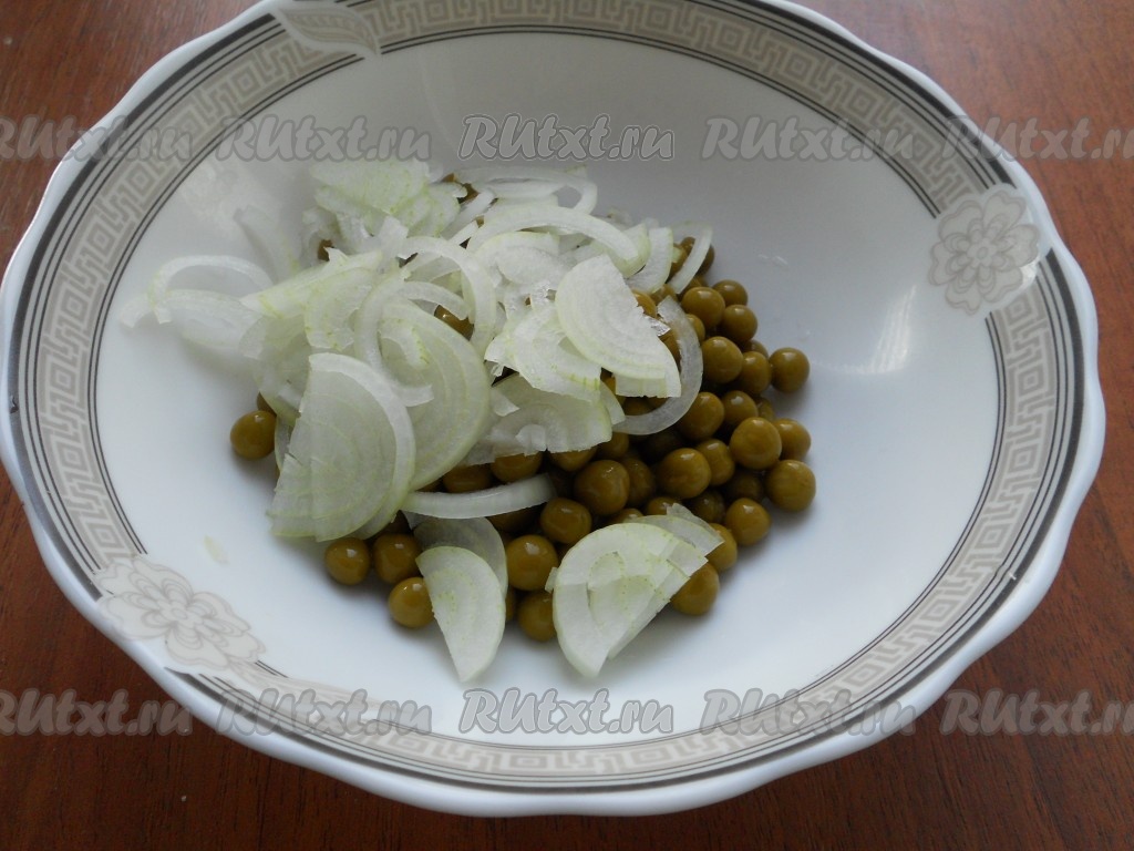 Консервированный горошек откинуть на дуршлаг, чтобы жидкость полностью стекла. Выложить горошек в глубокую посуду, добавить нарезанный тонкими полукольцами или перьями репчатый лук.