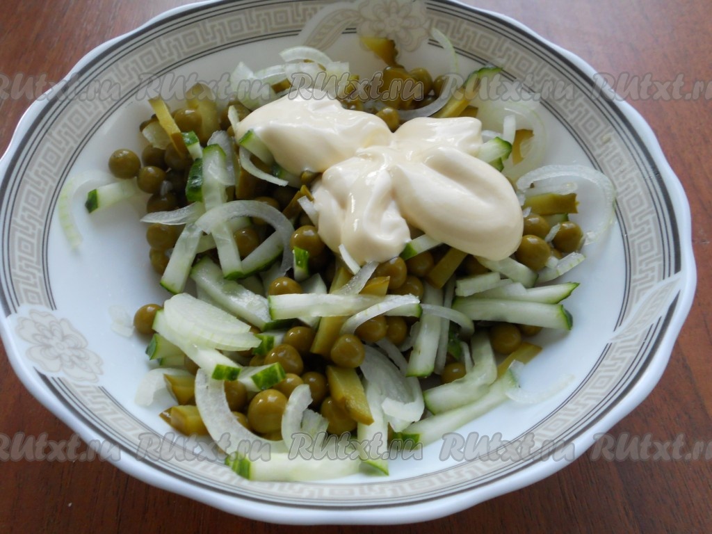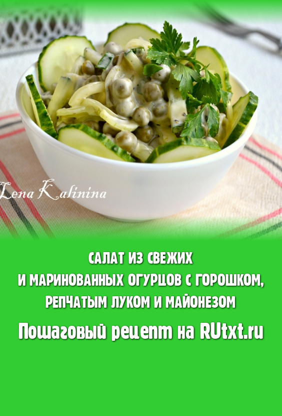 Посолить и поперчить салат по вкусу. Хорошенько перемешать, выложить в салатник. Вкусный салат из свежих и маринованных огурцов с репчатым луком и зелёным горошком сразу же подать к столу, украсив по своему усмотрению. Я украсила кружочками свежего огурчика.