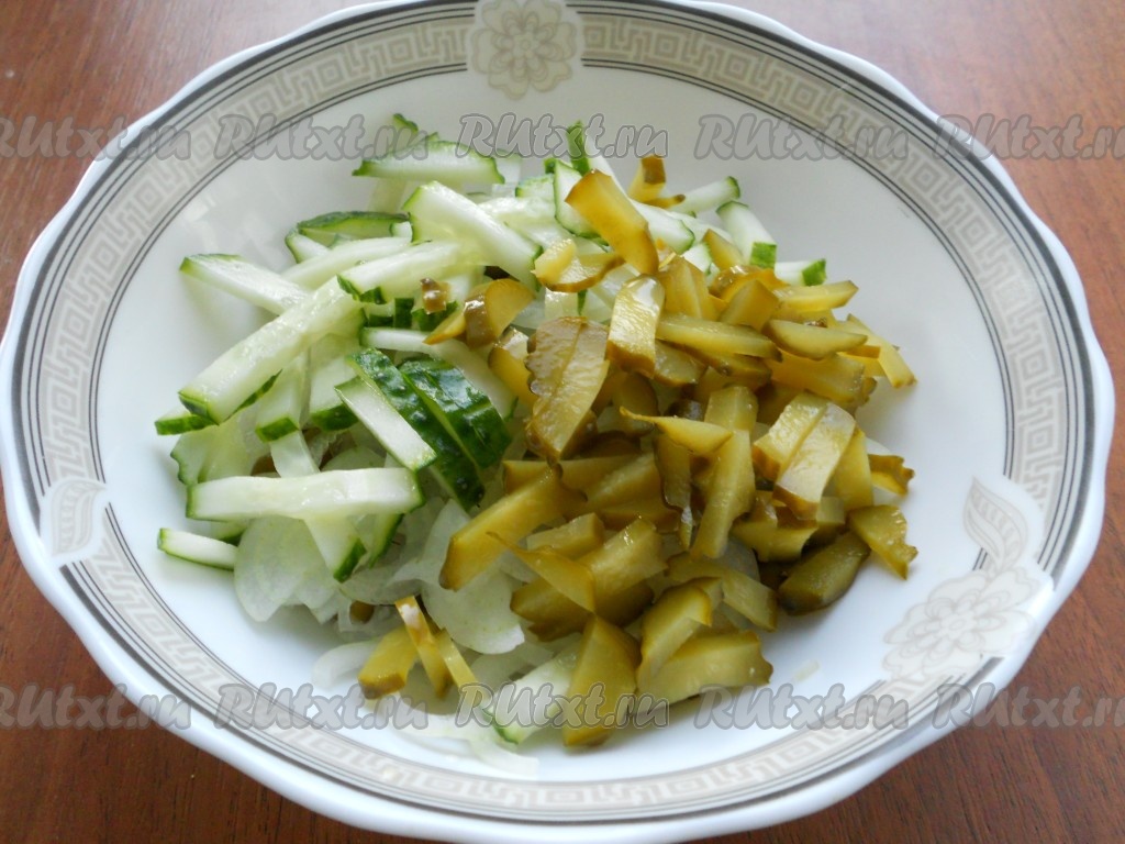 Свежий и маринованный огурцы нарезать брусочками, добавить в салат к зелёному горошку и луку.