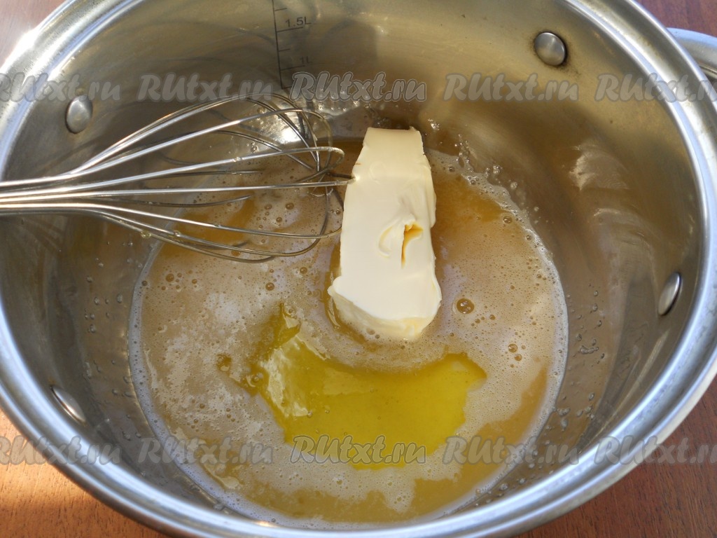 Расколотить хорошенько венчиком. Добавить мед (мед можно использовать любой - жидкий или засахаренный) и сливочное масло.
