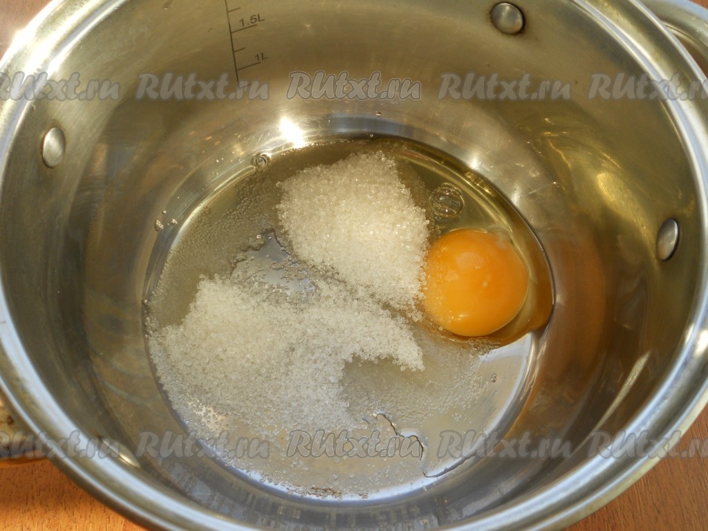В небольшую кастрюлю всыпать сахар, добавить яйцо.