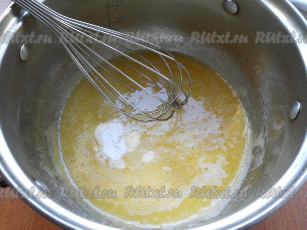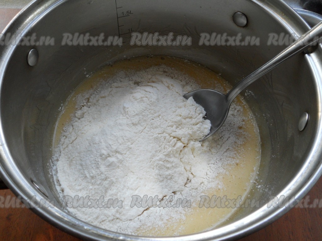 Далее поместить кастрюлю на водяную баню и варить до небольшого загустения массы и увеличения в объеме, периодически помешивая, чтобы не образовалось комочков. Это займет минут 5-6. В горячую массу всыпать просеянную муку.