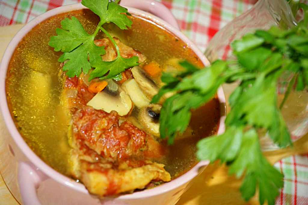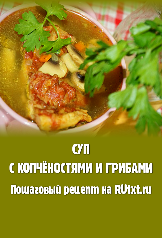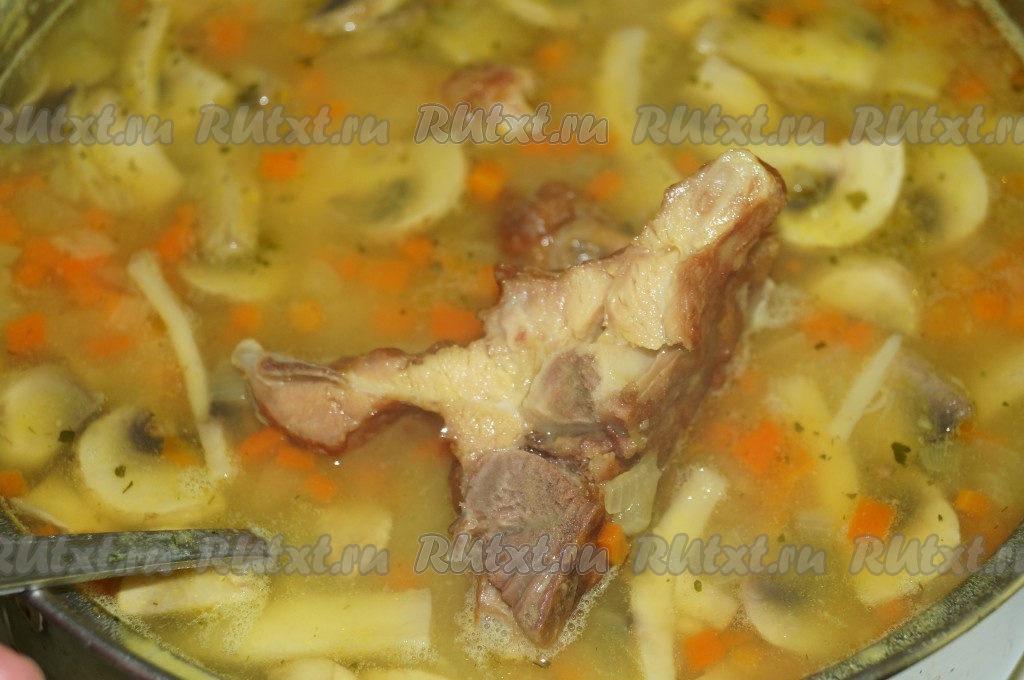 Наш вкусный, сытный суп с копчёными рёбрами и грибами готов. Подавать со свежей зеленью.