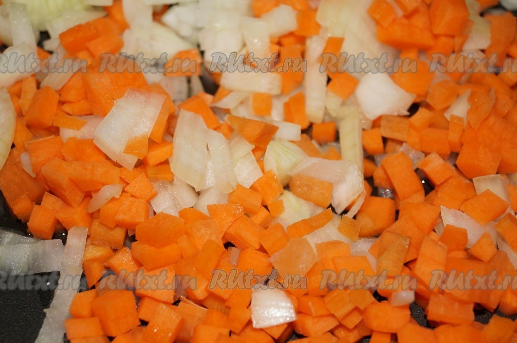 Для приготовления зажарки морковь и репчатый лук очистить, нарезать маленькими кубиками (по желанию морковь можно натереть на крупной тёрке). Обжарить минут 7-10 в небольшом количестве растительного масла до полуготовности, не забывая помешивать.