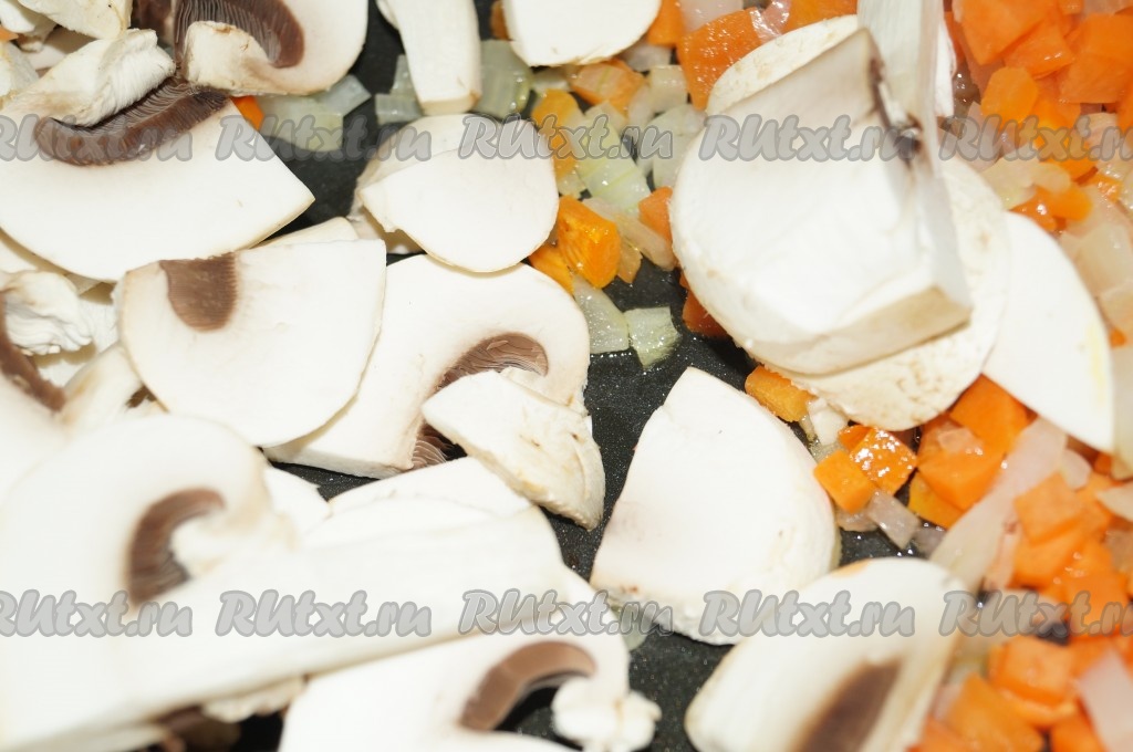 Грибы вымыть, нарезать на тонкие пластиночки и добавить к зажарке из моркови и лука, готовить минут 10, изредка помешивая. Добавить зажарку вариться в суп.