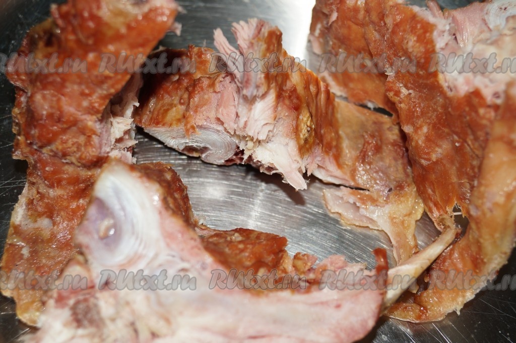 Копчёные рёбра хорошенько вымыть, переложить в кастрюлю, залить водой, довести до кипения, уменьшить огонь, варить до готовности минут 40, периодически снимая пену.