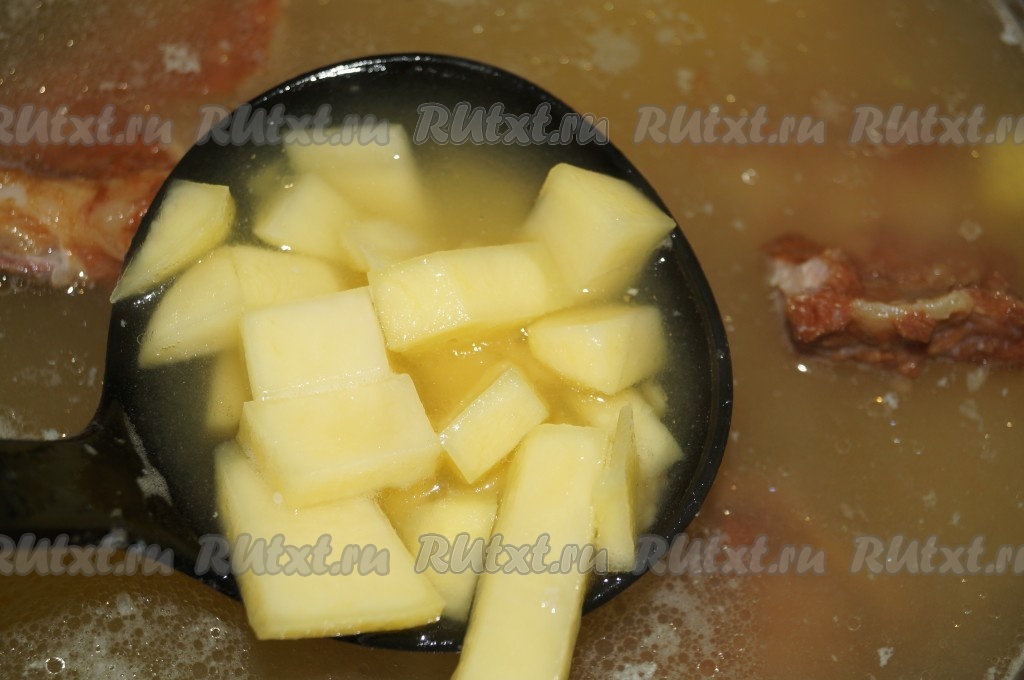 По истечении времени картофель очистить, нарезать на небольшие кубики и переложить вариться к гороху с копченостями минут на 10.