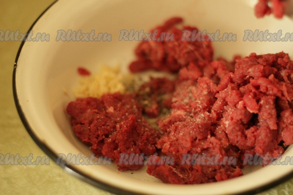 Добавить натертый чеснок, соль и перец. Фарш тщательно перемешать.