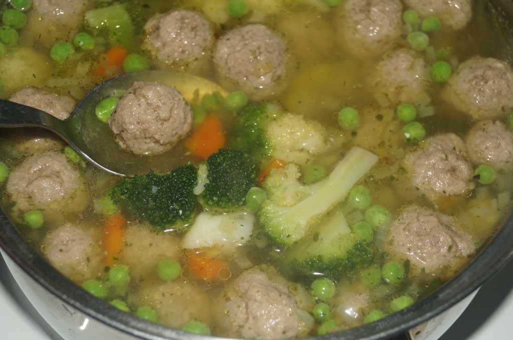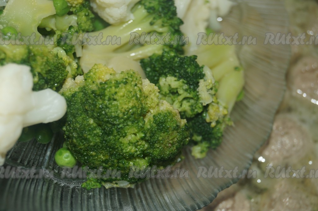 Брокколи и цветную капусту разобрать на соцветия и нарезать, зелёный горошек разморозить, а затем добавить в суп с фрикадельками.