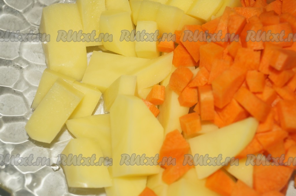Очищенный картофель нарезать небольшими кусочками. Очищенную морковь нарезать маленькими кубиками или натереть на крупной тёрке. Морковку и картошку добавить в суп к фрикаделькам и варить на маленьком огне минут 15.