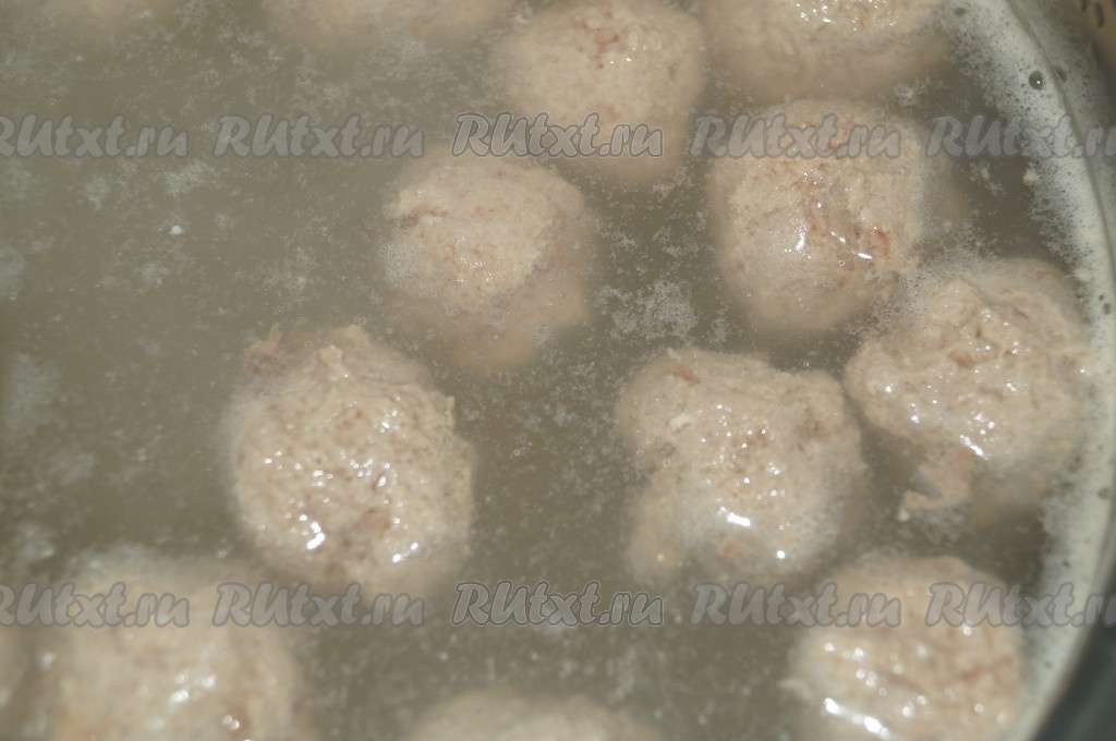 Из мясного фарша скатать небольшие шарики - фрикадельки. В кипящую воду добавить фрикадельки, затем довести до кипения и огонь уменьшить.