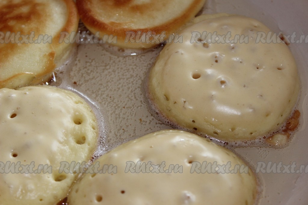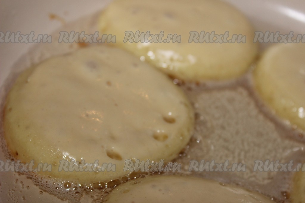 Жарить оладьи по 3-4 минуты с каждой стороны до золотистой корочки на умеренном огне.