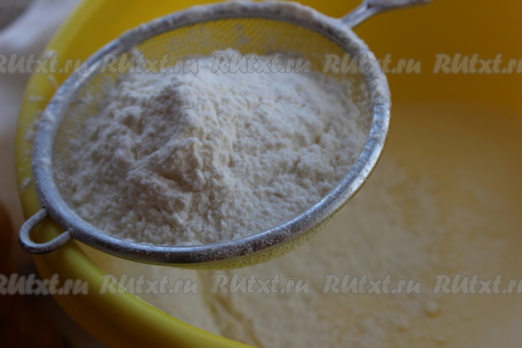 Муку просеять с разрыхлителем, содой и постепенно вводить в тесто, постоянно помешивая.