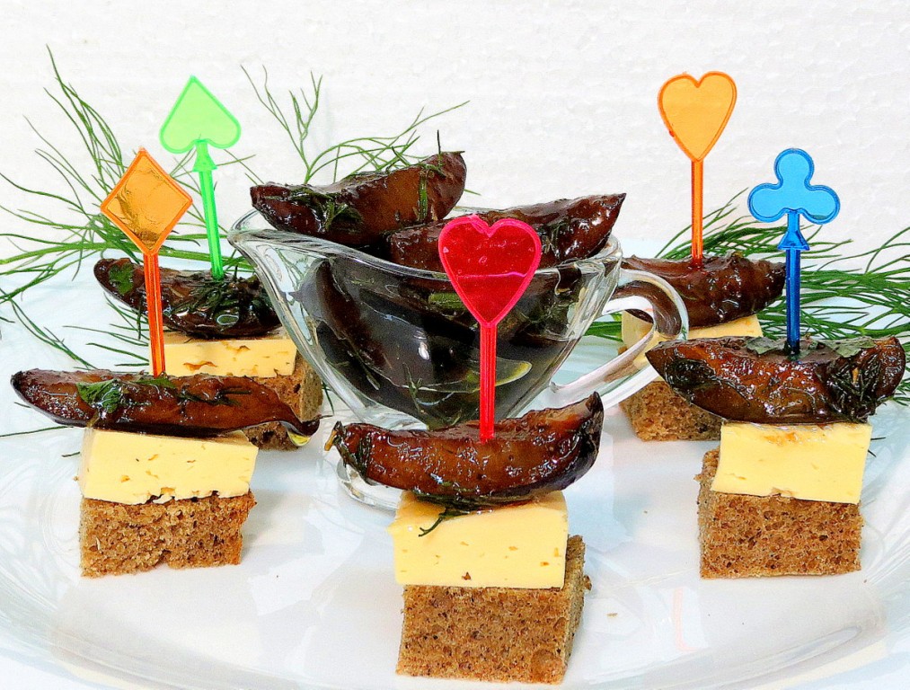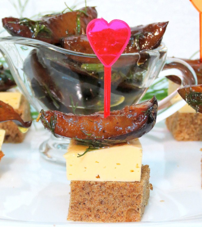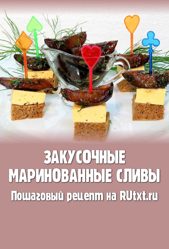 Для подачи мы нарезали квадратиками чёрный хлеб и сыр, а сверху положили маринованную сливу. Такие канапе - прекрасная закуска к мясу под фужер хорошего вина перед обедом. Прекрасно возбуждает аппетит! Наши гости остались довольны вкусом. Обязательно порадуйте близких маринованными сливами быстрого приготовления.