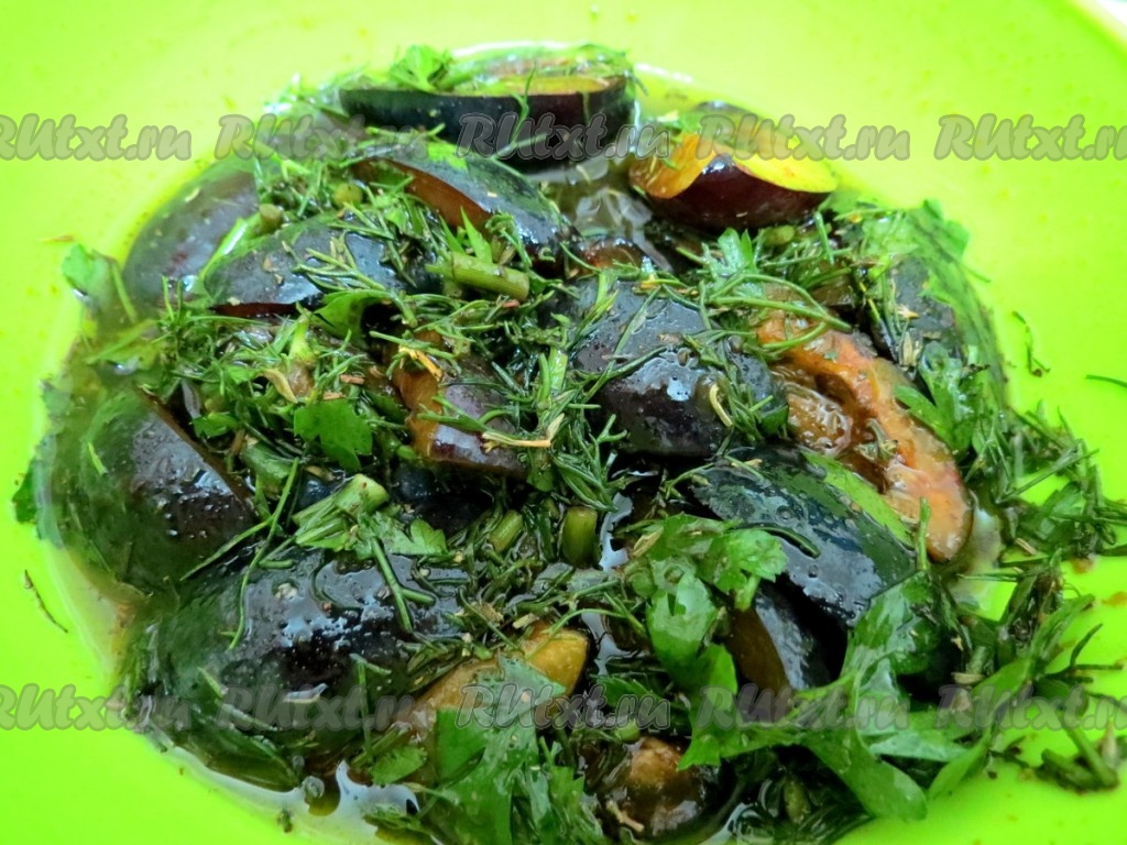 Соединяем сливы, зелень, специи, масло, соль и уксус, тщательно перемешиваем и отправляем в контейнер на сутки. Время от времени встряхивайте контейнер, чтобы сливы лучше замариновались.