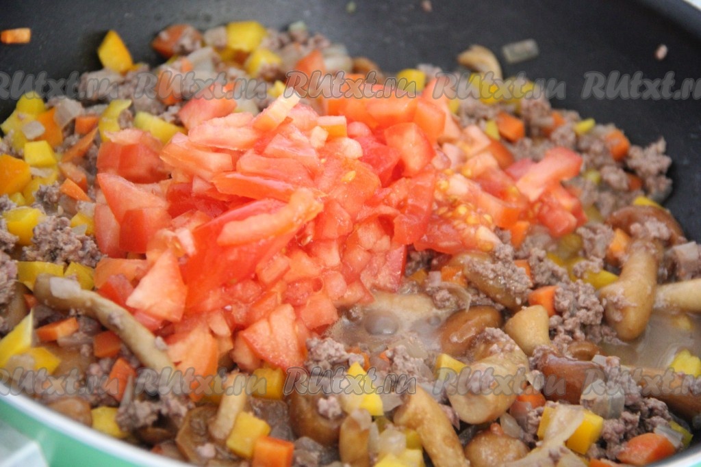 Помидоры мелко нарезать, по желанию можно снять с помидора шкурку. Добавить помидоры в сковороду и перемешать.