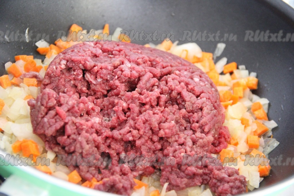 Затем добавить в сковороду фарш и обжарить его в течение 5 минут, периодически помешивать и разбивать комочки.