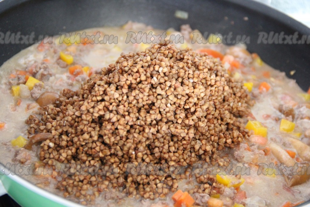 Далее влить бульон или воду и всё слегка перемешать. Затем всыпать гречневую крупу.
