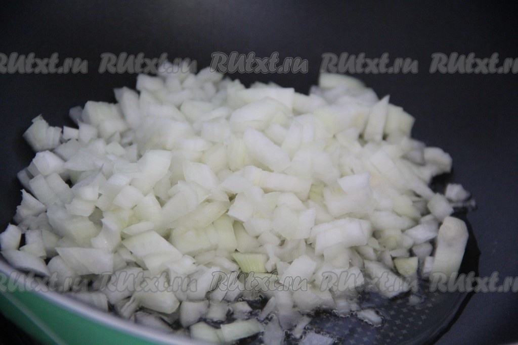 В глубокую сковороду влить масло. Лук мелко нарезать и добавить в сковороду.