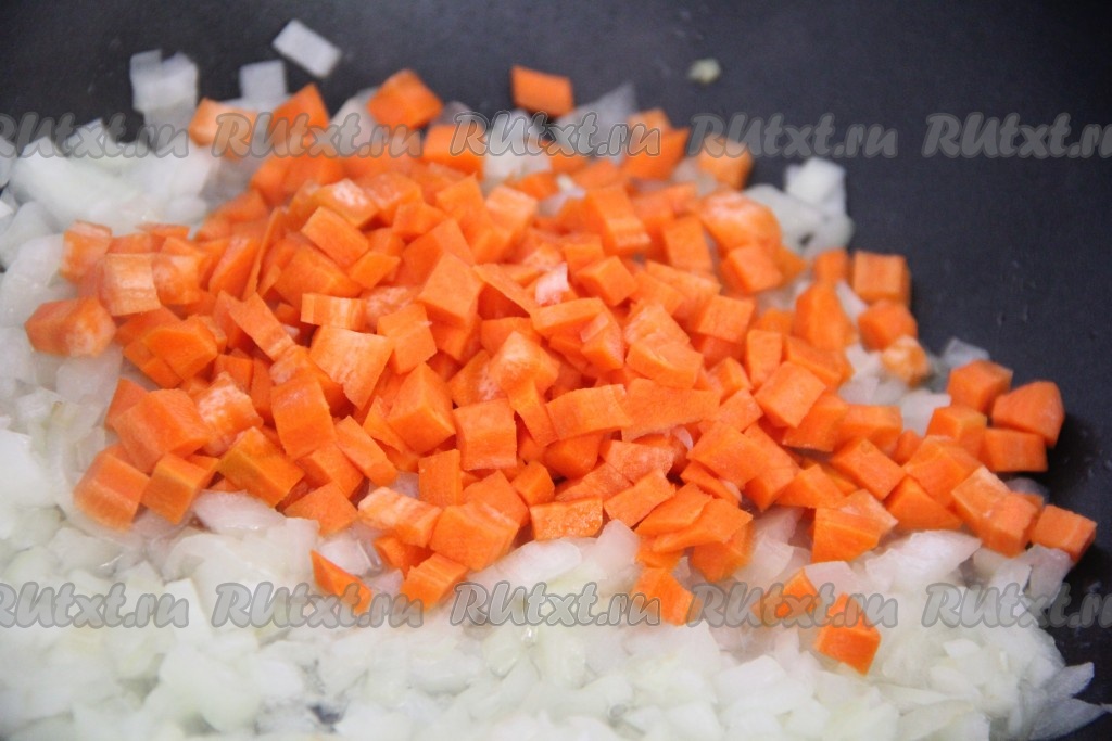 Обжарить лук, помешивая, до золотистого цвета. Морковь нарезать на мелкие кубики, по желанию можно натереть на крупной тёрке. Добавить морковь в сковороду к луку и хорошо перемешать. Обжарить овощи, иногда перемешивая, в течение нескольких минут.