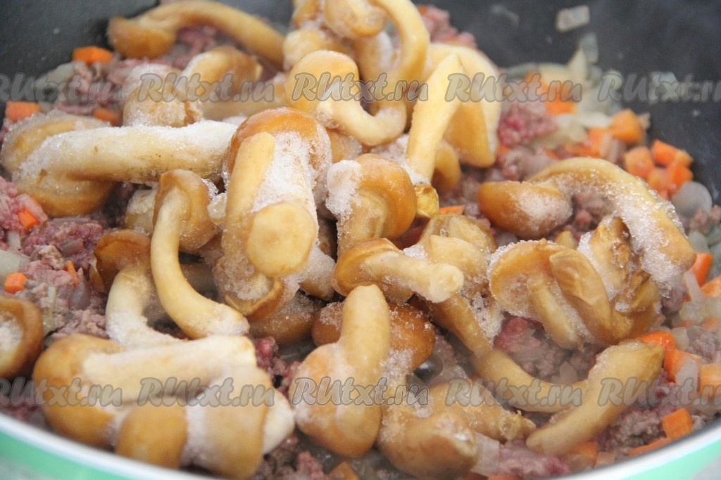 Затем добавить грибы в сковороду и хорошо перемешать. Жарить в течение нескольких минут, можно пару раз перемешать. Если использовать свежие шампиньоны, нужно их нарезать тонкими пластинками и добавить в сковороду.