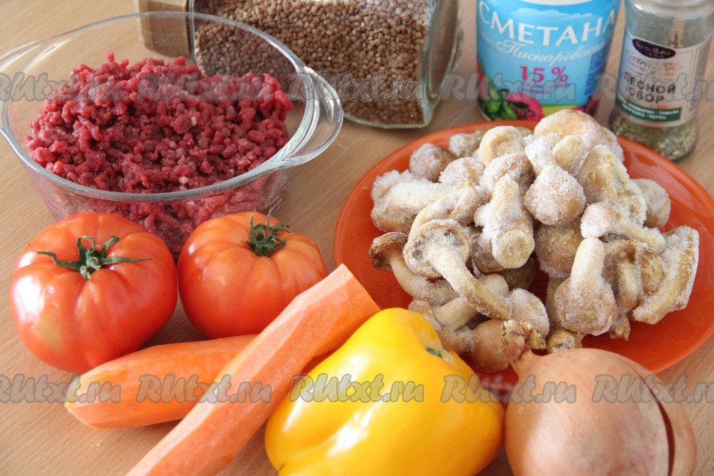 Подготовить продукты. Если использовать замороженные грибы, можно их не размораживать заранее. Если берёте свежие шампиньоны, тогда вымыть грибы и нарезать их тонкими пластинками. Лук и морковь почистить. Перец и помидоры вымыть. Фарш можно взять готовый, а можно приготовить самостоятельно, пропустив мясо через мясорубку. Гречку перебрать и хорошо промыть.