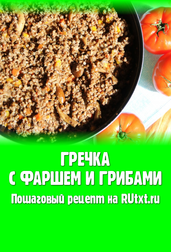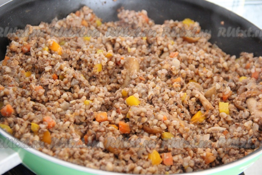 Всё хорошо перемешать, накрыть сковороду крышкой и убавить огонь до минимума. Готовить гречку с фаршем и грибами в течение 30-35 минут.