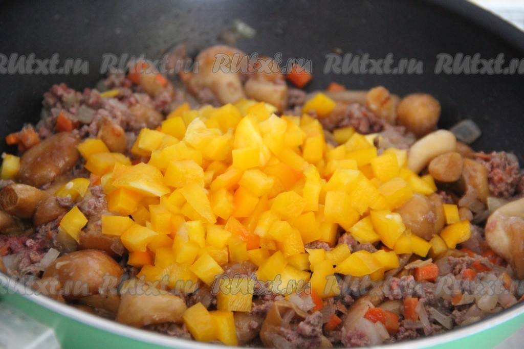 Перец очистить от семян и плодоножки. Нарезать перец мелким кубиком и добавить в сковороду. Всё хорошо перемешать и жарить 2-3 минуты.