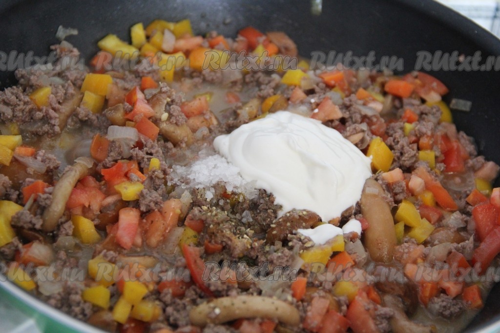 Затем добавить сметану, соль и специи. Я добавила грибную приправу. Всё хорошо перемешать.