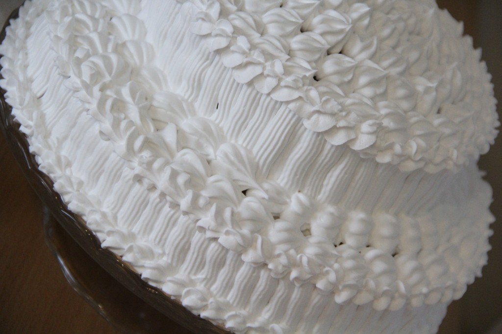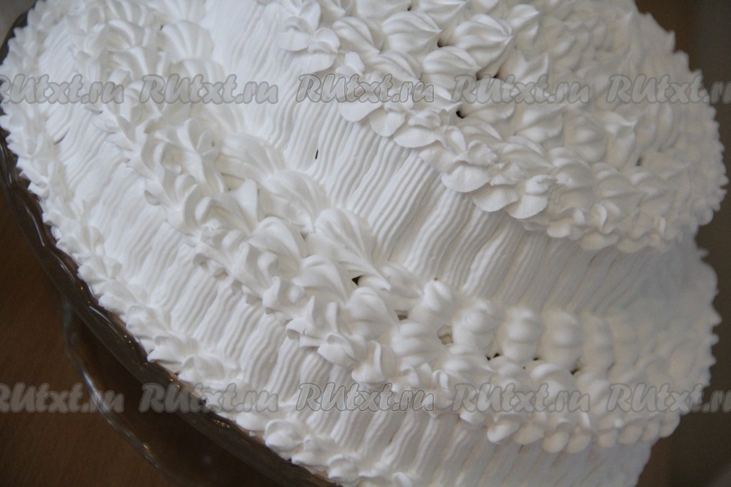 Переложить взбитые сливки в кондитерский мешок и нанести с помощью насадки на бока и верх торта.