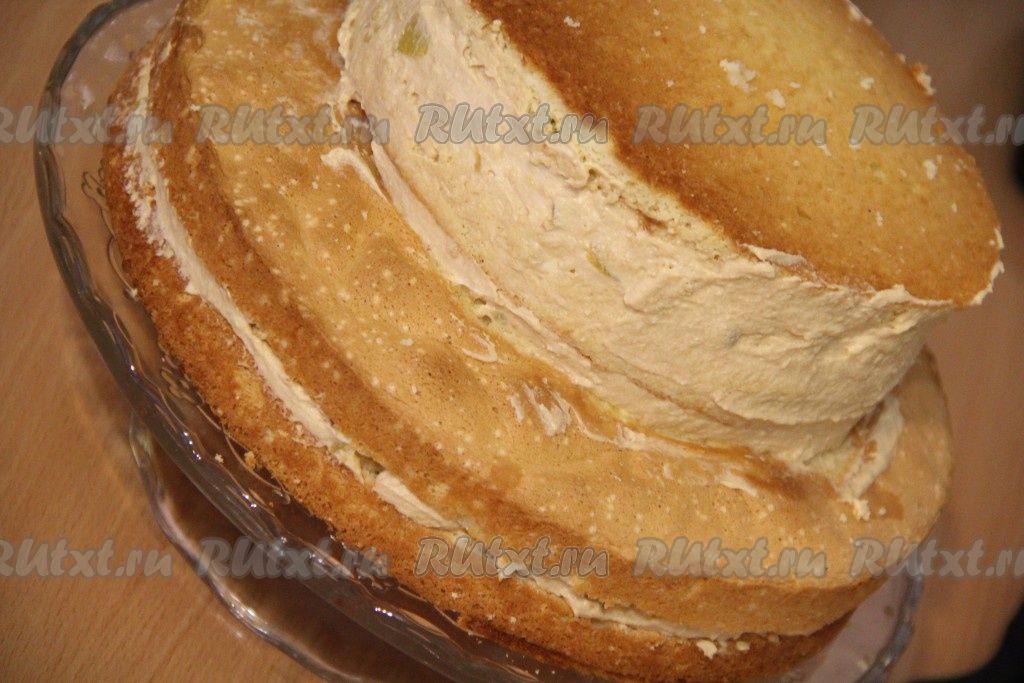 Накрыть крем вторым коржом и слегка прижать. Затем на середину коржа выложить небольшое количество крема и выложить маленький корж срезом вверх.