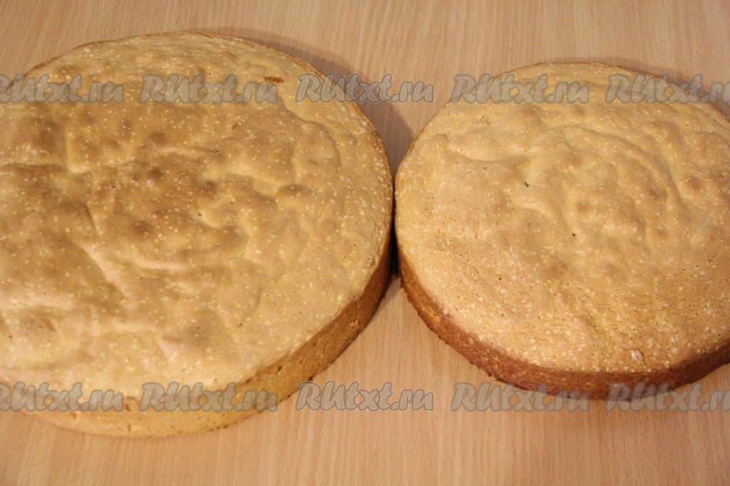 Готовность бисквита проверить сухой лучинкой (если лучинка после прокалывания бисквита останется сухой, значит пора вынимать из духовки). Готовый бисквит горячим вынуть из формы, перевернуть на решётку и оставить до полного остывания. Аналогично приготовить второй бисквит диаметром 22 сантиметра и тоже оставить остывать на решётке. Кстати, бисквиты можно приготовить заранее (например, за сутки), после остывания завернуть в пищевую плёнку и оставить до подходящего момента.