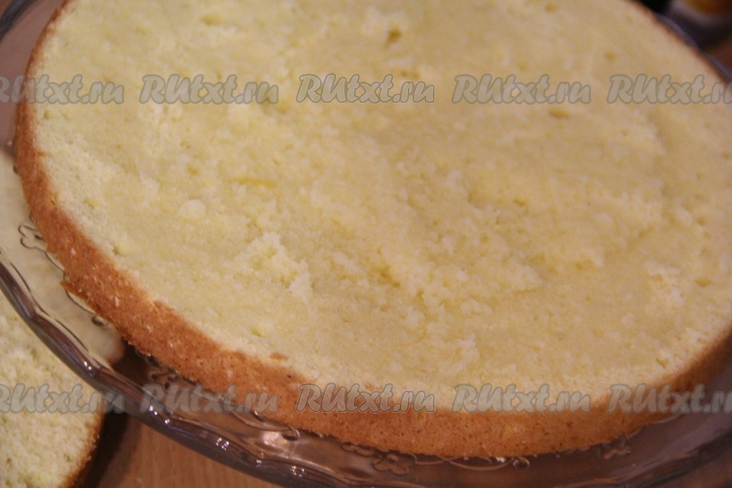 Каждый корж разрезать на две части и пропитать сиропом. Я использовала сироп от консервированных персиков.