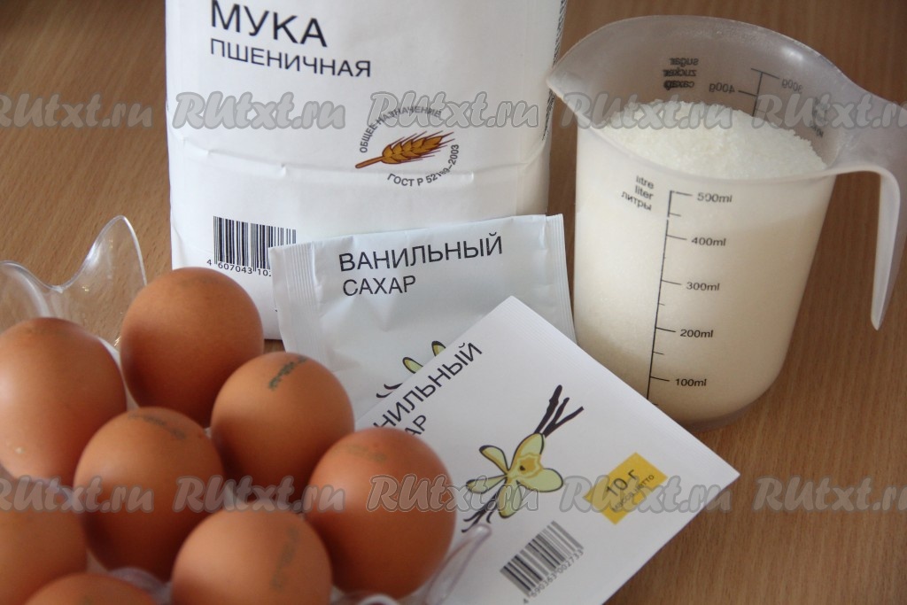 Подготовить продукты для бисквитов. Я выпекала бисквиты в разъёмной форме диаметром 28 сантиметров и в разъёмной форме диаметром 22 сантиметра. Поэтому продукты разделила: на большой бисквит - 5 яиц, 250 грамм сахара, 250 грамм муки и пакетик ванильного сахара, а на маленький бисквит - 3 яйца, 150 грамм муки, 150 грамм сахара и пакетик ванильного сахара.