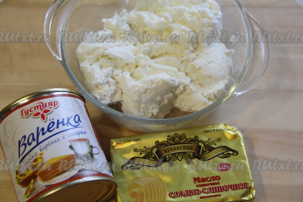 Пока наши бисквиты остывают, займёмся приготовлением крема. Творог можно взять любой жирности, но не слишком сухой. Сахар в крем не добавляем, так как сгущёнка сделает своё дело. Масло предварительно достать из холодильника, чтобы оно согрелось до комнатной температуры и стало мягким.