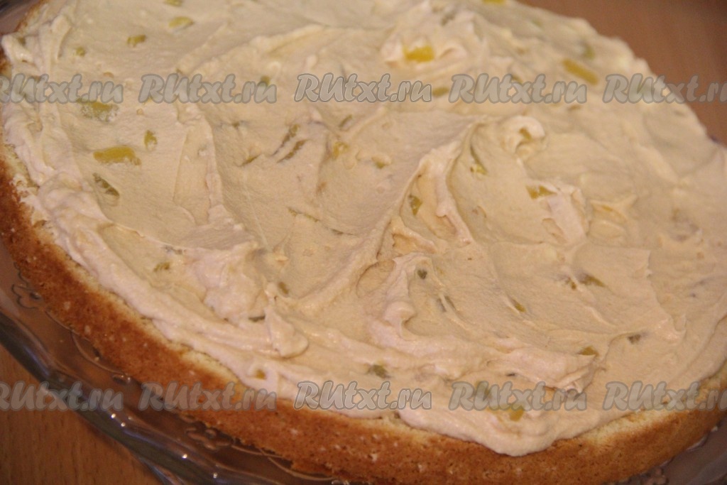 Затем большой корж выложить на плоскую тарелку (или подставку под торт) срезом вверх. Нанести на корж часть крема и равномерно распределить его по поверхности коржа.