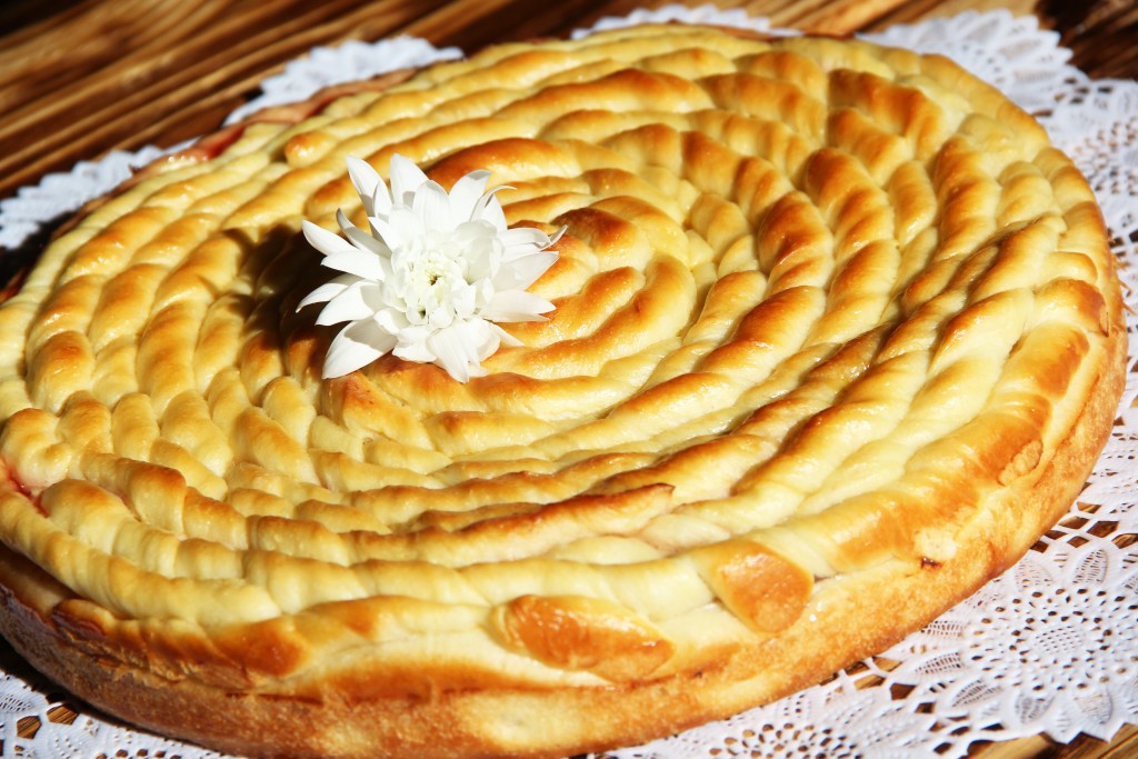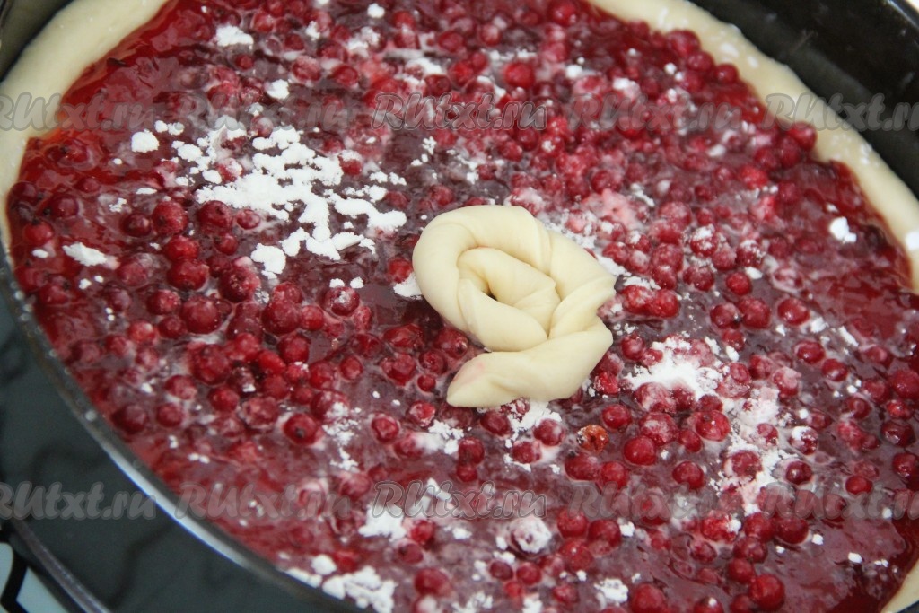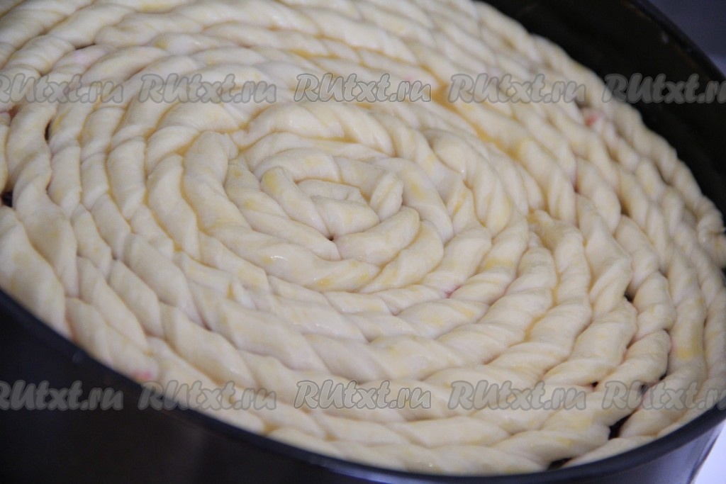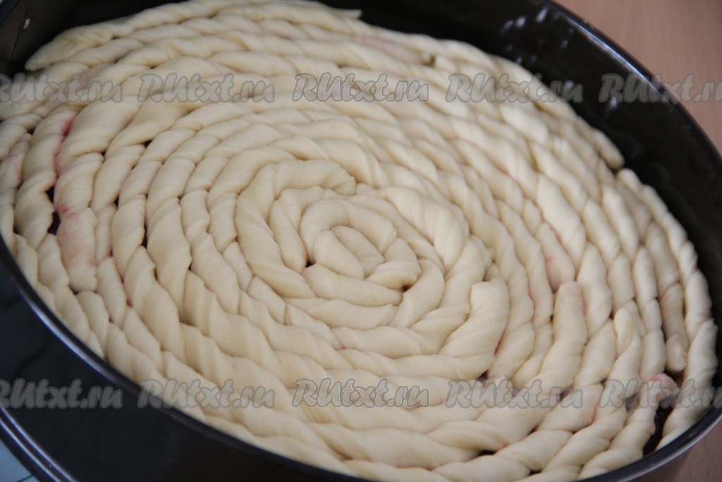 Выложить жгутики в круговую, начиная с середины дрожжевого пирога с вареньем.