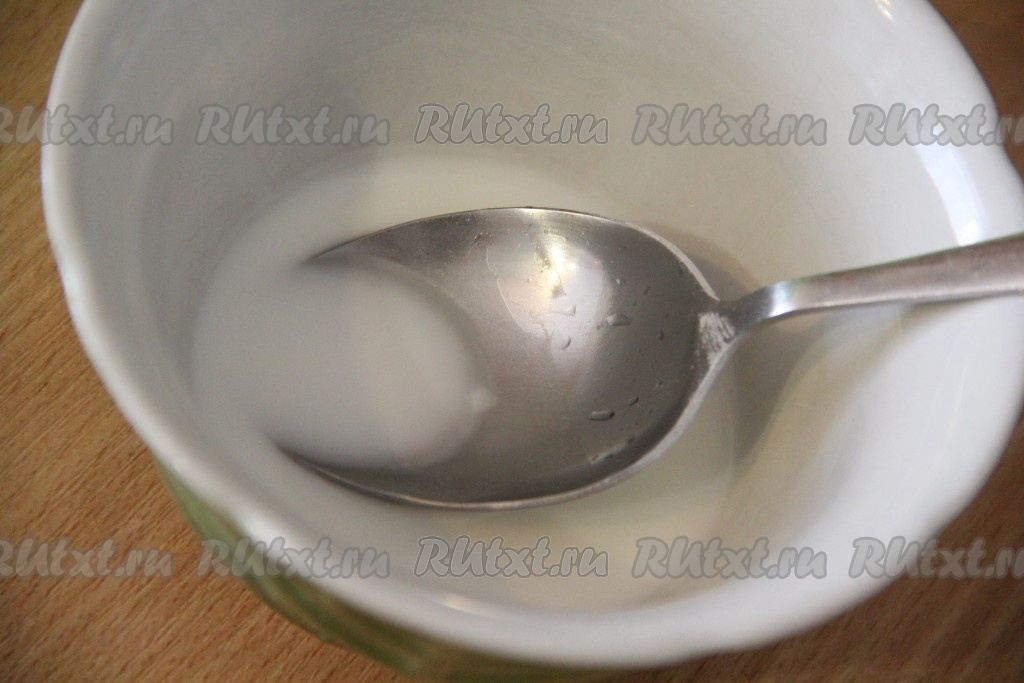 В небольшую ёмкость всыпать 0,5 столовой ложки крахмала, влить 1 столовую ложку холодной воды, тщательно перемешать, чтобы не было комочков.