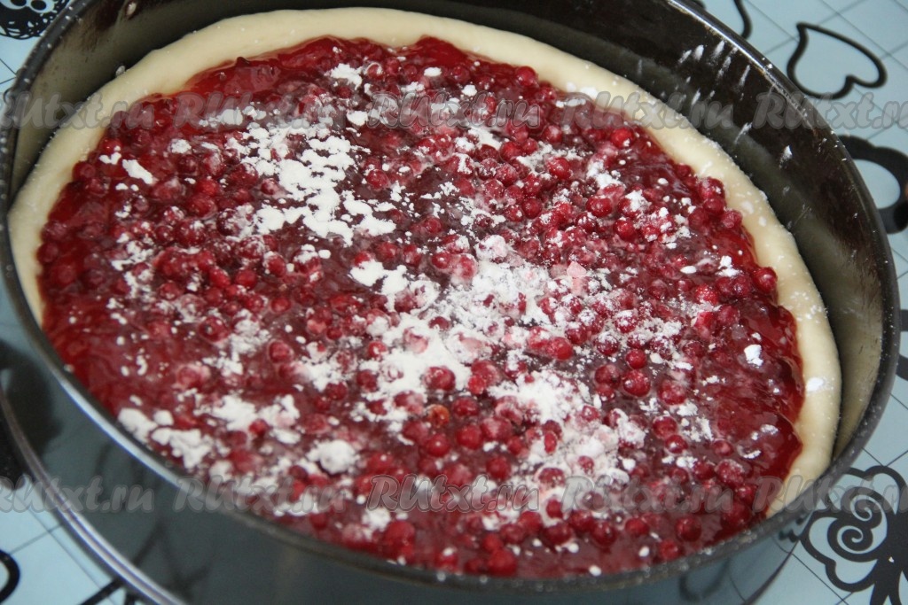 Форму для выпечки смазать растительным маслом. Выложить тесто в форму и сформировать бортик. Выложить варенье поверх теста и разровнять. Поверхность варенья припорошить 1 чайной ложкой крахмала.