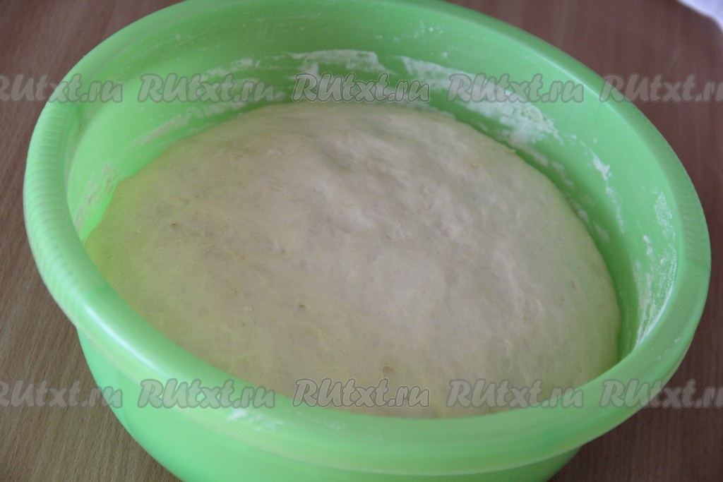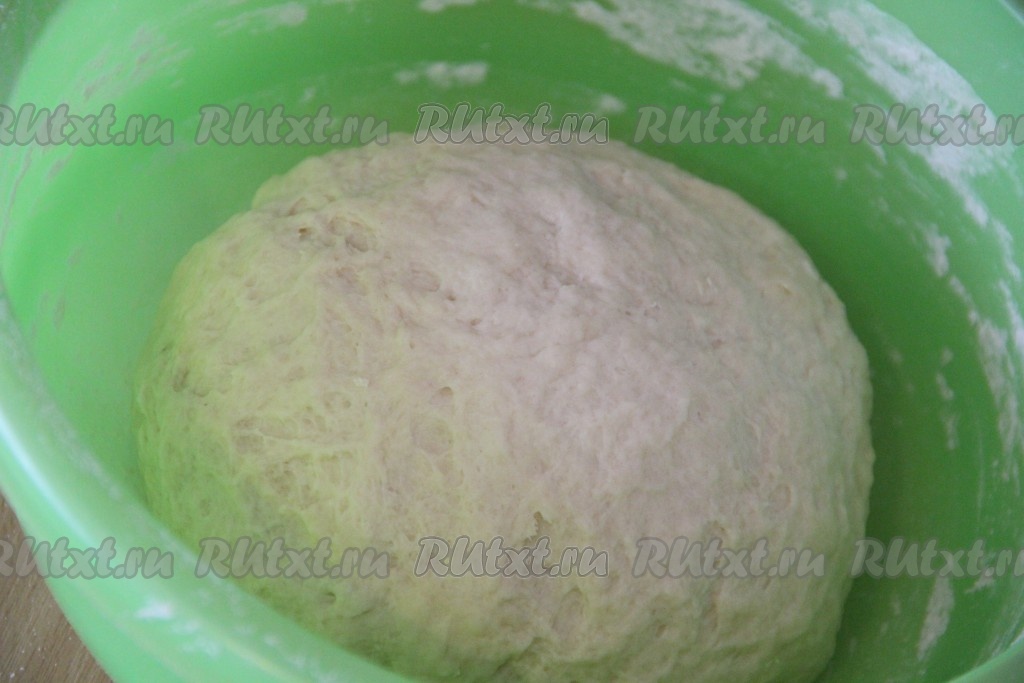 Поднявшееся тесто выложить на силиконовый коврик (или на поверхность, припорошенную мукой), хорошо обмять. Прикрыть тесто полотенцем и оставить на столе на 30 минут, а затем ещё раз хорошо обмять.