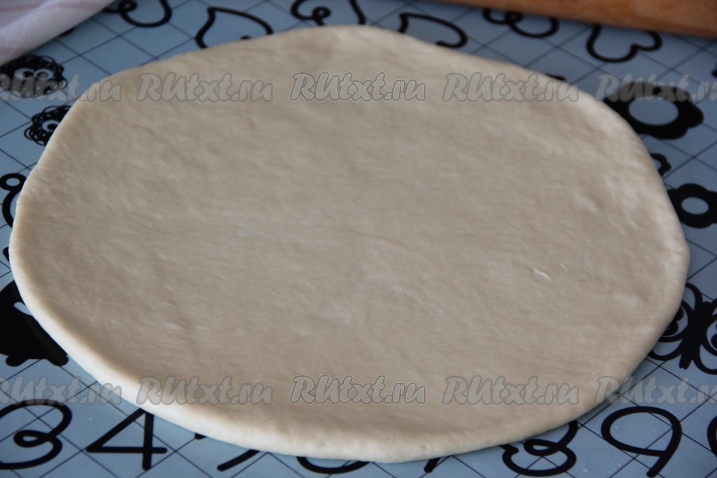 Готовое тесто разделить на 2 части. Одну часть теста раскатать с помощью скалки в нетонкий круг.