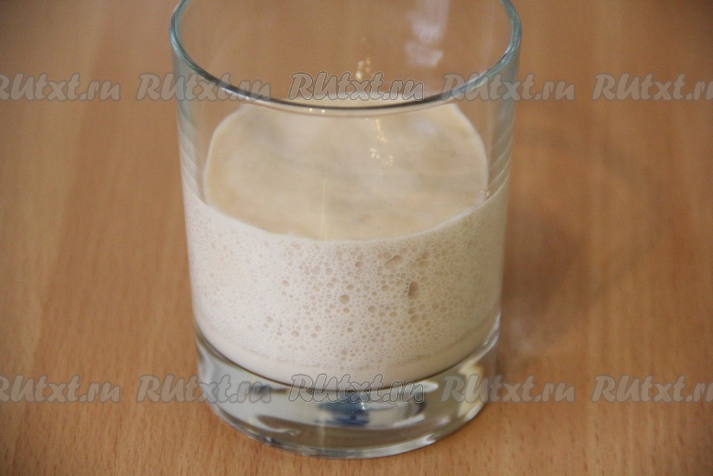 Замешивать дрожжевое тесто начнём с приготовления опары. Для этого в стакан нужно всыпать дрожжи, влить 50 миллилитров воды, подогретой до 38-40 градусов, и оставить минут на 10-15. По истечении этого времени на поверхности дрожжевой смеси появится пышная шапочка, означающая, что дрожжи начали работать.