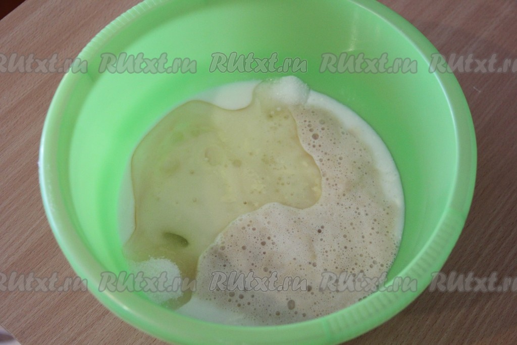 В глубокую миску влить кефир комнатной температуры (я подогрела кефир в течение 30 секунд при максимальной мощности в микроволновке), добавить запенившуюся дрожжевую смесь, крахмальную смесь, растительное масло, сахар, соль, слегка перемешать.