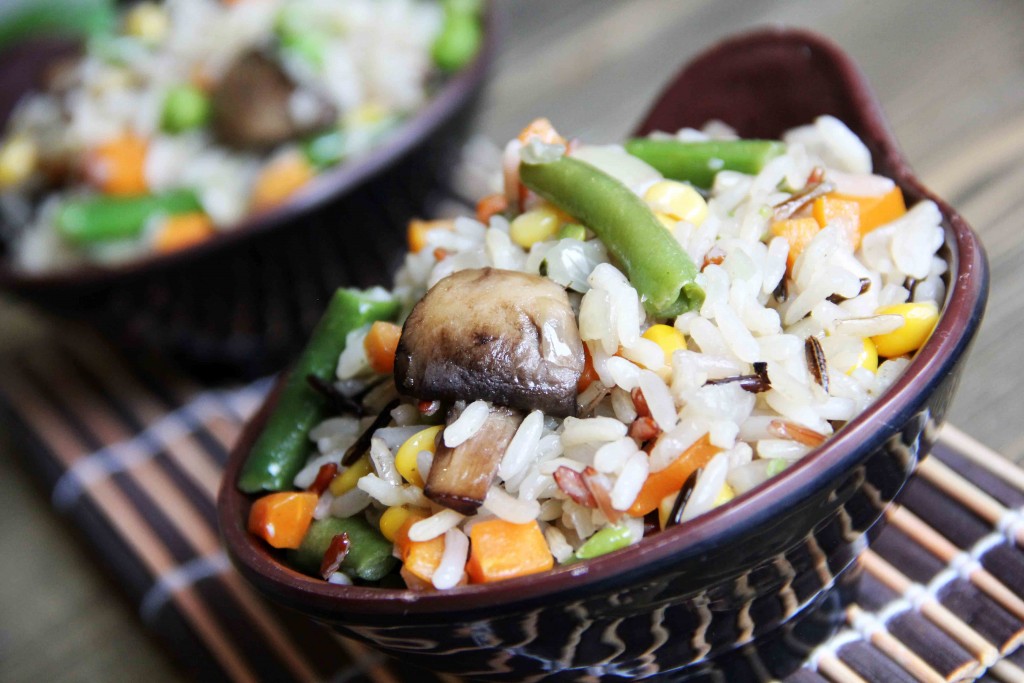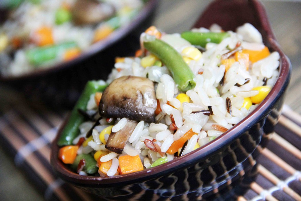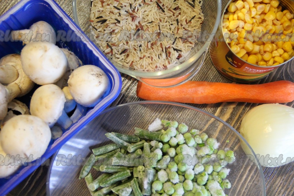 Хочу поделиться рецептом приготовления вкусного гарнира из риса, овощей и грибов. Блюдо готовится довольно просто. Прекрасно подойдут и свежие, и замороженные овощи. Такой гарнир можно смело подать как основное блюдо, а кто хочет посытнее, добавьте котлетку или жареную колбаску.