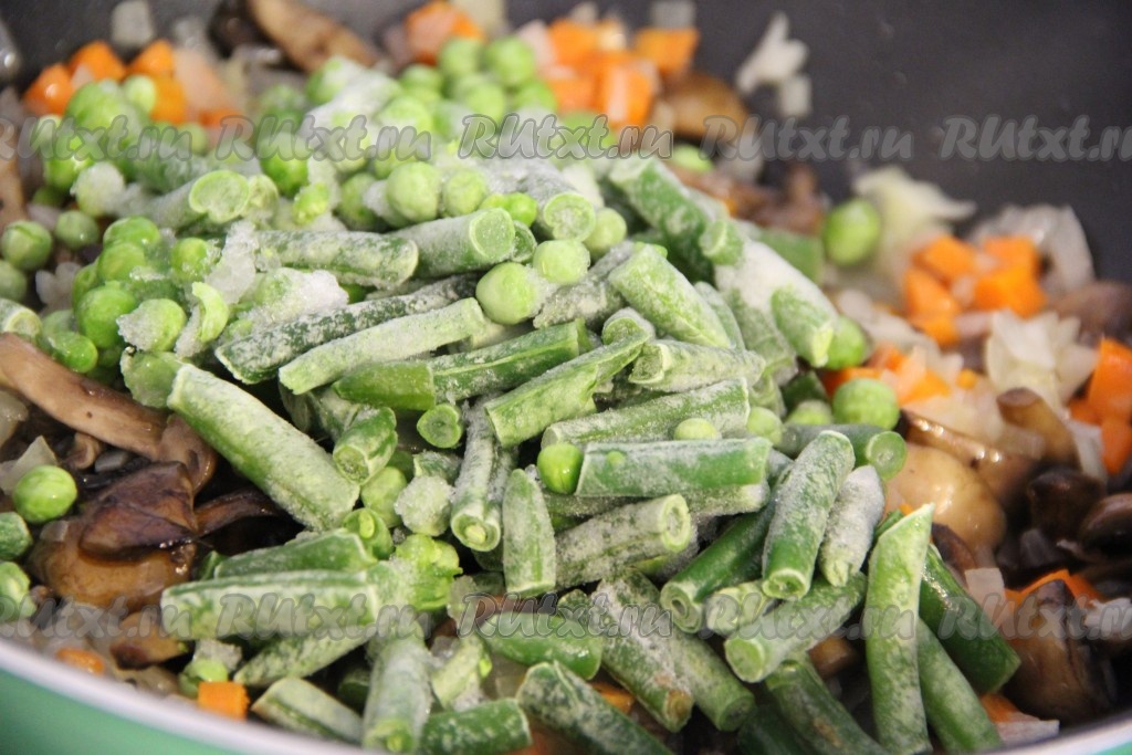 Затем добавить горошек и фасоль. Я не размораживала овощи. Всё хорошо перемешать и обжарить в течение нескольких минут.