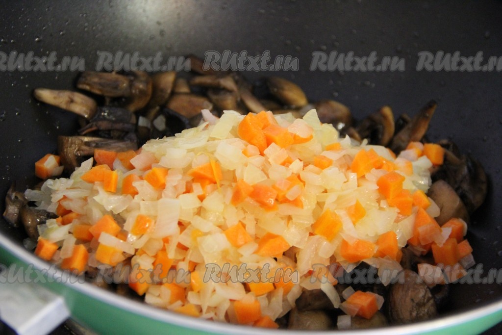 Добавить обжаренные овощи в сковороду к грибам и хорошо перемешать.