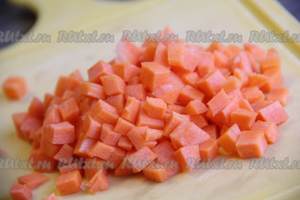 Морковь нарезать мелкими кубиками (можно натереть морковь на крупной тёрке).