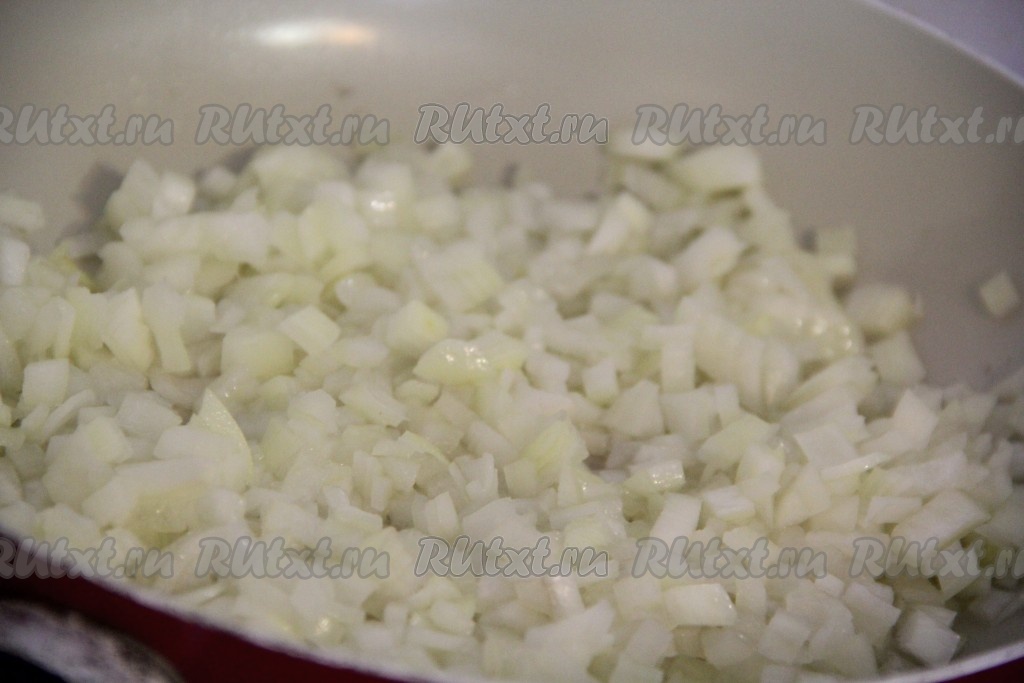 В отдельную сковороду влить растительное масло и добавить лук. Обжарить лук, иногда помешивая, до золотистого цвета.